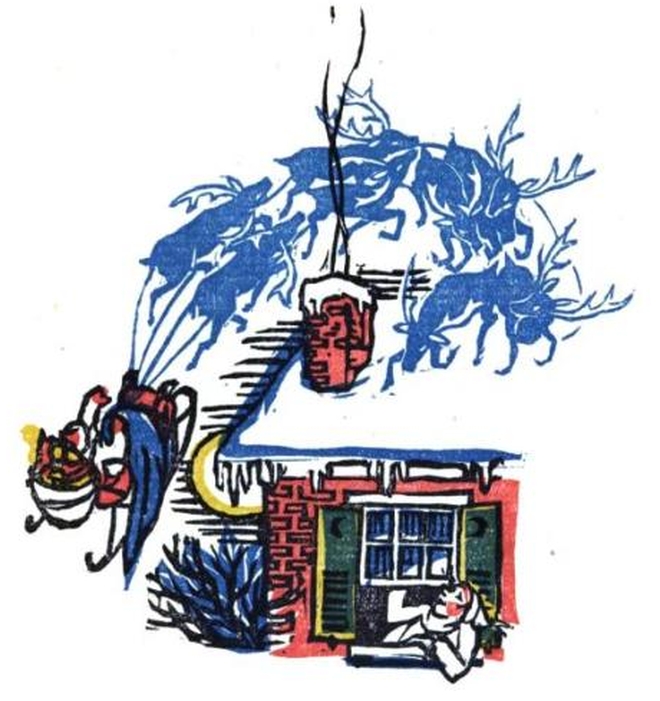 That shook when he laughed, like a bowl full of jelly. fíe was chubby and plump, a right jolly old elf, And I laughed when I saw him in spite of myself. A wink of his eye and a twist of his head Soon gave me to know I had nothing to dread; He spoke not a word, but went straight to his work, And filled all the stockings; then turned with a jerk, And laying his finger aside of his nose, And giving a nod, up the chimney he rose, sprang to his sleigh, to his team gave a whistle, And away they all flew like the down of a thistle. But I heard him exclaim, ere he drove out of sight, "Happy Christmas to all, and to all a good-night."