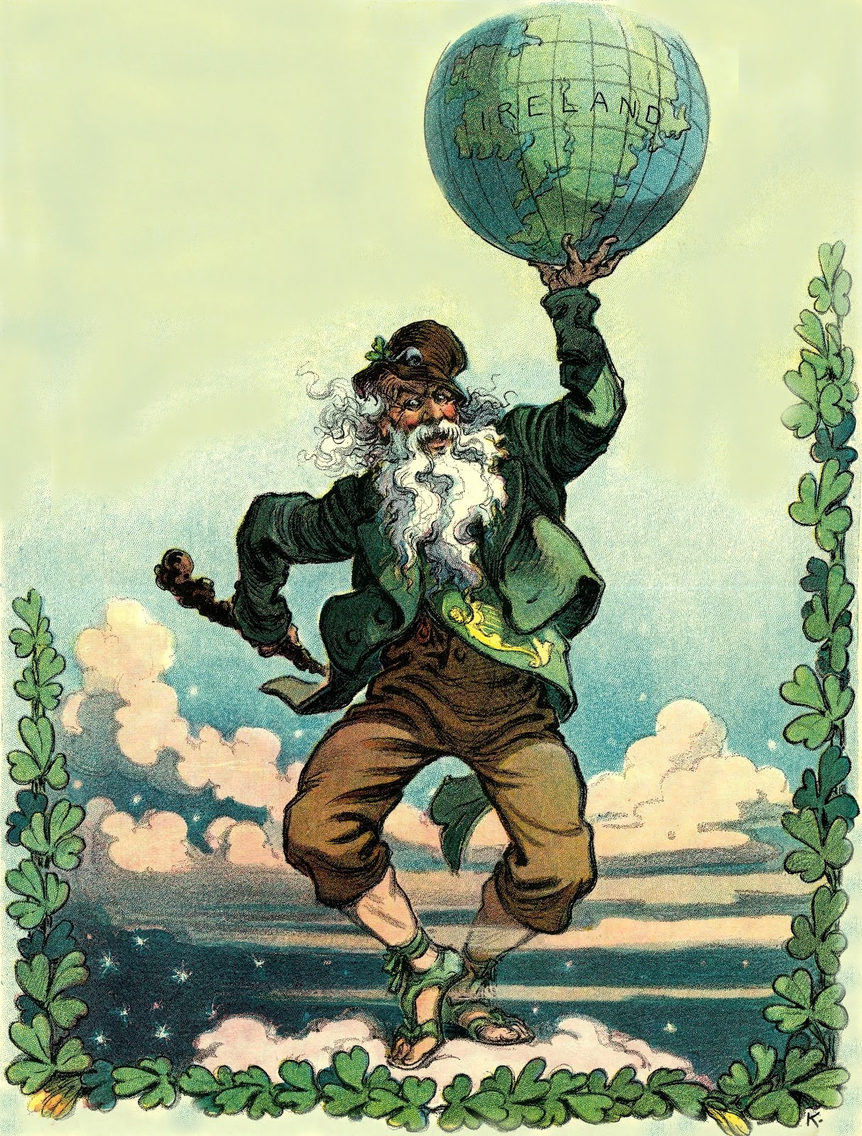Summary: Illustration shows an old Irish man as Atlas holding aloft a globe that shows "Ireland" as comprising an entire hemisphere, in his other hand he holds a shillelagh. Shamrocks line the sides and bottom of the design and the title "Puck" is composed of Celtic knots.