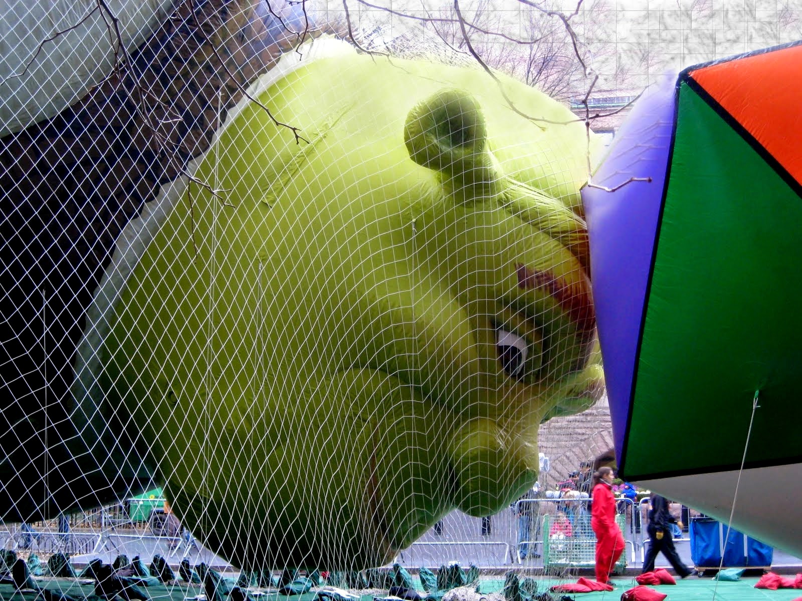 Shrek balloon contemplates puny humans preflight Macy's Thanksgiving Day Parade on west 77th street. #NYC #Thanksgiving image/editing/sookietex more at Public Domain Clip Art - http://publicdomainclip-art.blogspot.com/