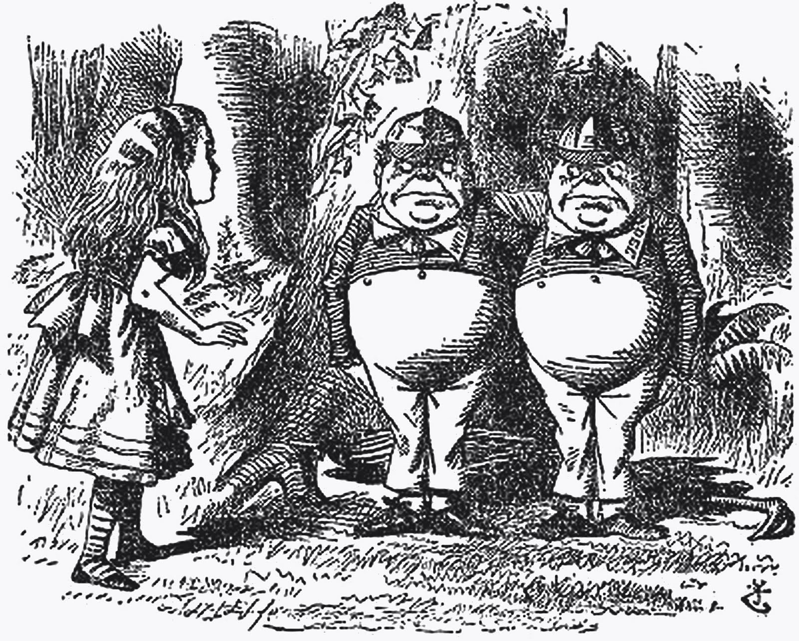 Tweedledum and TweedledeeThis Image (or other media file) is in the public domain because its copyright has expired. This applies to the United States, where Works published prior to 1923 are copyright protected for a maximum of 75 years. See Circular 1 "COPYRIGHT BASICS" PDF from the U.S. Copyright Office. Works published before 1923 (in this case 1871) are now in the public domain.